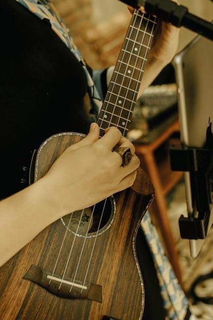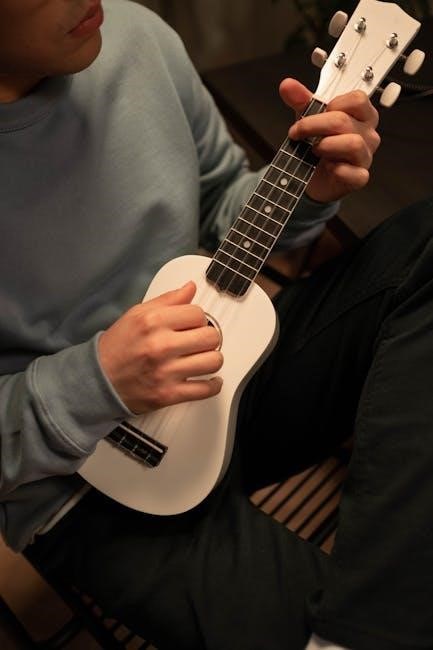 The G7 chord adds a crucial harmonic color to “Somewhere Over the Rainbow” on the ukulele‚ providing a gentle pull towards the C Major chord. To play G7‚ position your index finger (1st finger) on the 1st fret of the E string‚ your middle finger (2nd finger) on the 2nd fret of the C string‚ and your ring finger (3rd finger) on the 2nd fret of the A string.